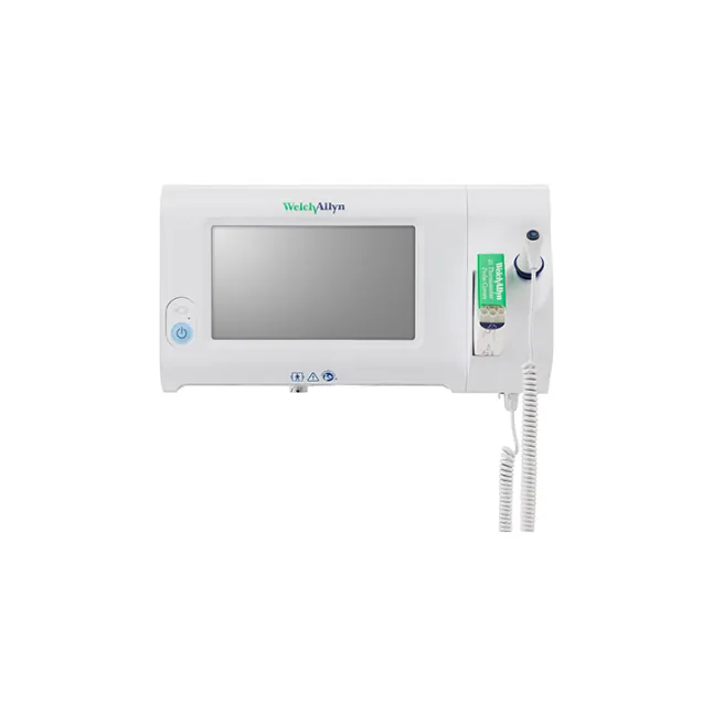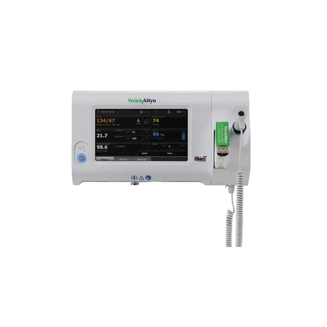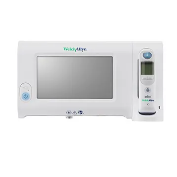 The Connex® Spot Monitor 7400 is a reliable and accurate patient monitoring device that provides vital signs measurement including blood pressure averaging, digital respiration rate, spot checking, interval monitoring, and custom scoring. This device features an easy-to-use, vivid touchscreen display and can be upgraded to WiFi connectivity. Its SureBP® technology provides quick and accurate blood pressure readings in only 15 seconds, and the device can connect wirelessly to your EMR to send vitals directly to the patient chart. This device is also customizable with optional wall unit integration, thermometry and pulse oximetry choices, and mounting/mobility options.