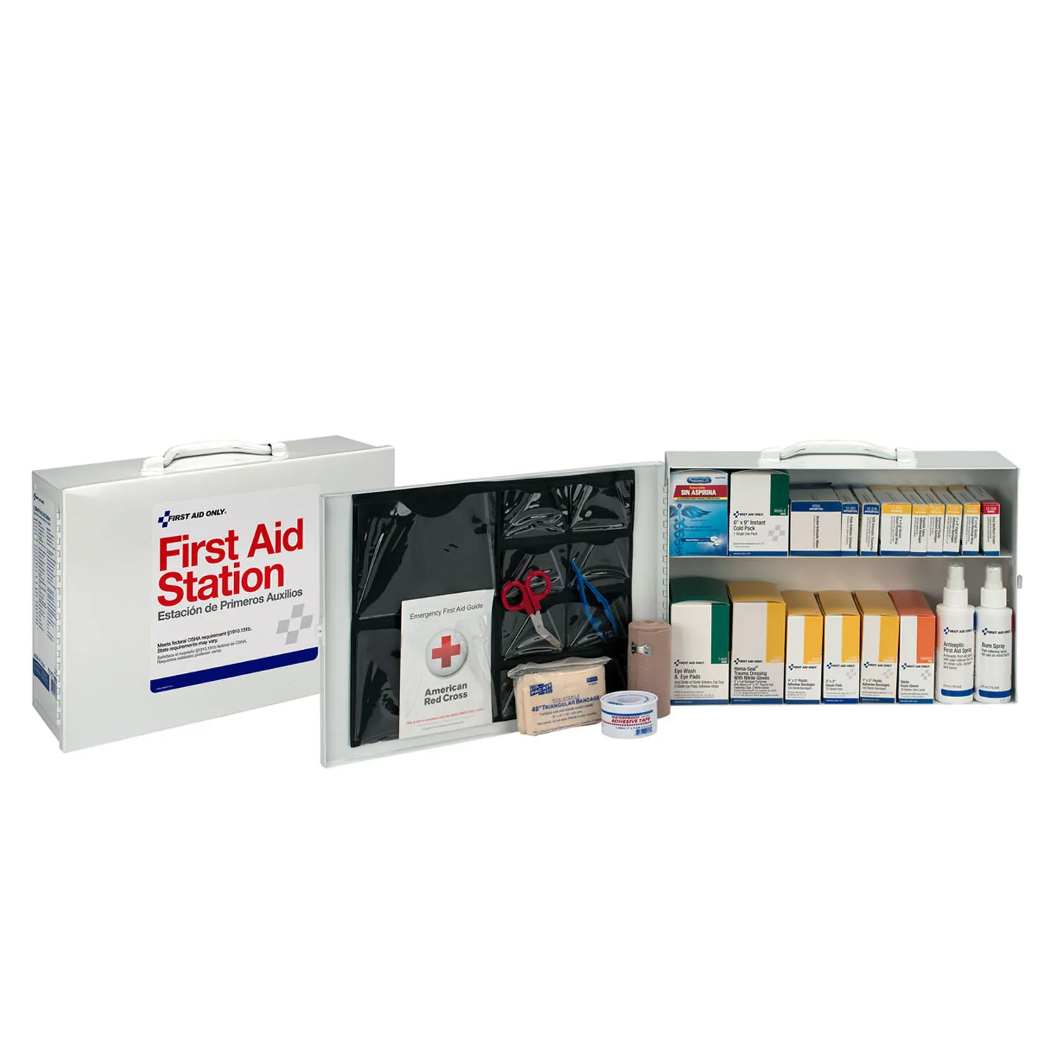 First Aid Only’s first aid stations contain the required products that make them conform to ANSI Z308.1-2009 standard. Each station features a tough metal cabinet that can be portable or wall mounted. State OSHA/ANSI compliant by using the handy, color-coded reordering guide. Station Contains: (1) G155: 3/4″x3″ Adhesive plastic bandages, 100/bx; (1) G121: 1″x3″ Fabric bandages, 50/bx; (1) G140: 25 Knuckle & 25 fingertip fabric bandages; (1) I228: 24 – 2″x2″, 24 – 3″x3″ Gauze dressing pads; (1) AN205: 5″ X 9″ Trauma pad, 1/bx; (2) 2″ Conforming gauze roll bandages; (1) 3″ Conforming gauze roll bandage; (1) 36″ Triangular sling/bandage, w/2 safety pins; (1) AN5071: 40″ Triangular sling/bandage, w/2 safety pins, 1/bx; (1) H410: Aspirin tablets, (50) 2-pks; (1) H418: Extra-strength non-aspirin tablets, (50) 2-pks; (2) A340: Alcohol cleansing pads, 10/bx; (1) B304: BZK antiseptic towelettes, 18/bx; (1) A403: Triple antibiotic ointment packs, 10/bx; (1) 2″x5 yd. 3-Cut first aid tape; (1) B503: 4″x5″ Instant cold compress, 1/bx; (1) M531: Burn spray, 3 oz.; (1) A200: Sterile eye pads, 2/bx; (1) Eye wash, 4 oz.; (1) AN5112: Exam quality vinyl gloves, 2 pr/bx; (1) 4-1/2″ Scissors, nickel plated; (1) 4″ Tweezers, plastic; (1) First aid guide