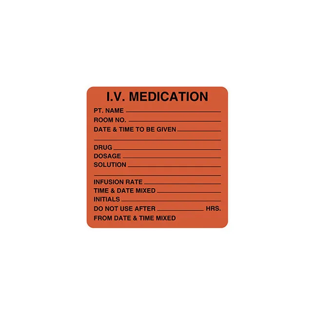 Designed to call attention to vital information concerning the administration of IVs, these brightly colored labels act as signal to attending personnel. Meets all current regulations.