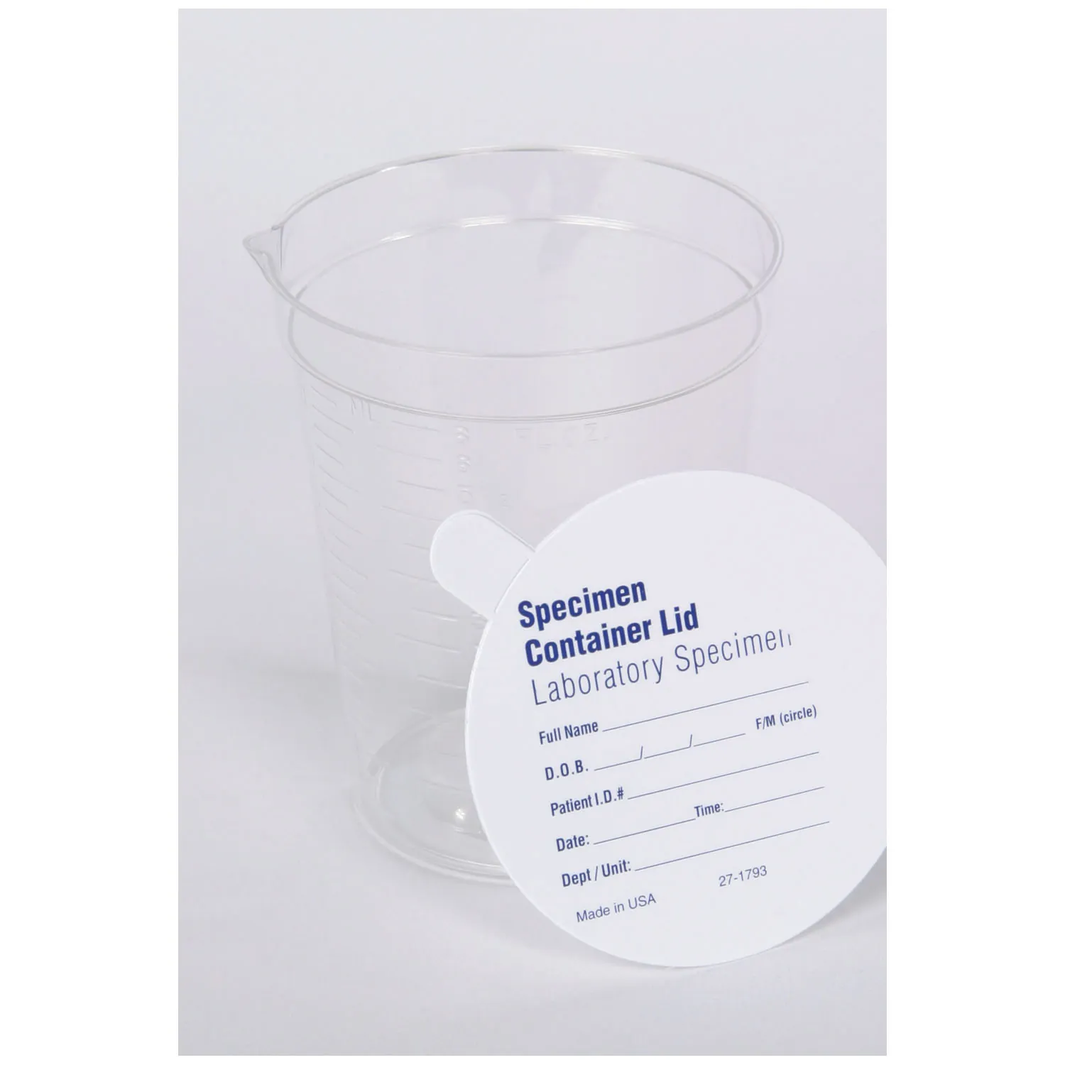 These containers are available in both polystyrene and polypropylene. Polystyrene enhances clarity while polypropylene improves durability. Both options come with a convenient pour spout for simplified specimen retrieval. Printed lids can be purchased separately. Lids have lines for patient name, doctor, date, time, am/pm, room number and case number.